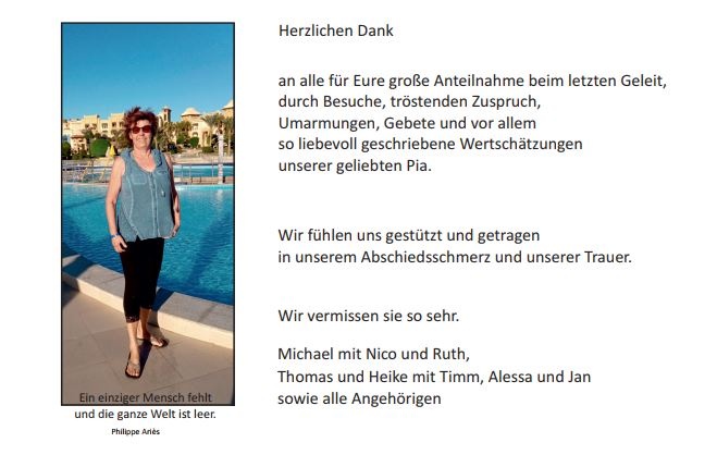 Mit großem Schrecken habe ich diese Anzeige gefunden, ich bin tief betroffen und sende mein Mitgefühl. Ich war mit Pia in der Ausbildung im PFS in Kirchheim. Eine zeit lang hatten wir noch Kontakt, aber später nicht mehr. Ich habe Sie auch als lustige und besondere Persönlichkeit in Erinnerung.